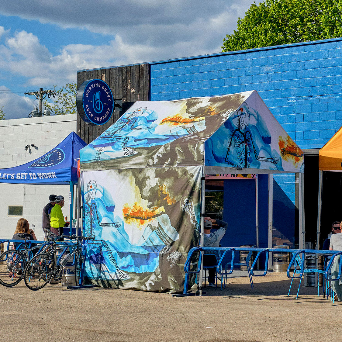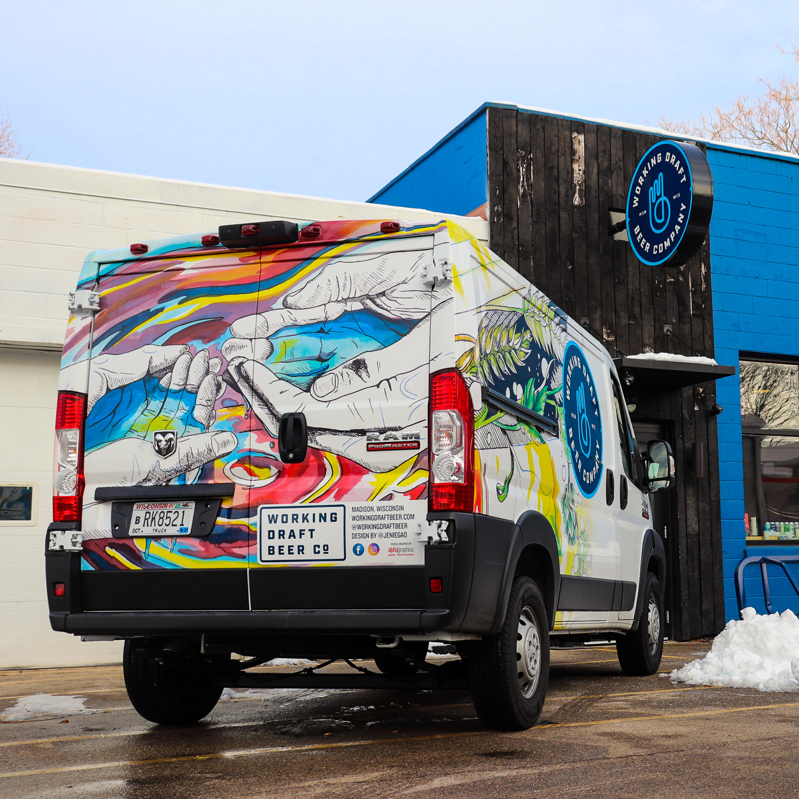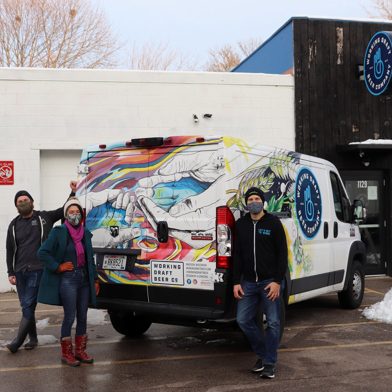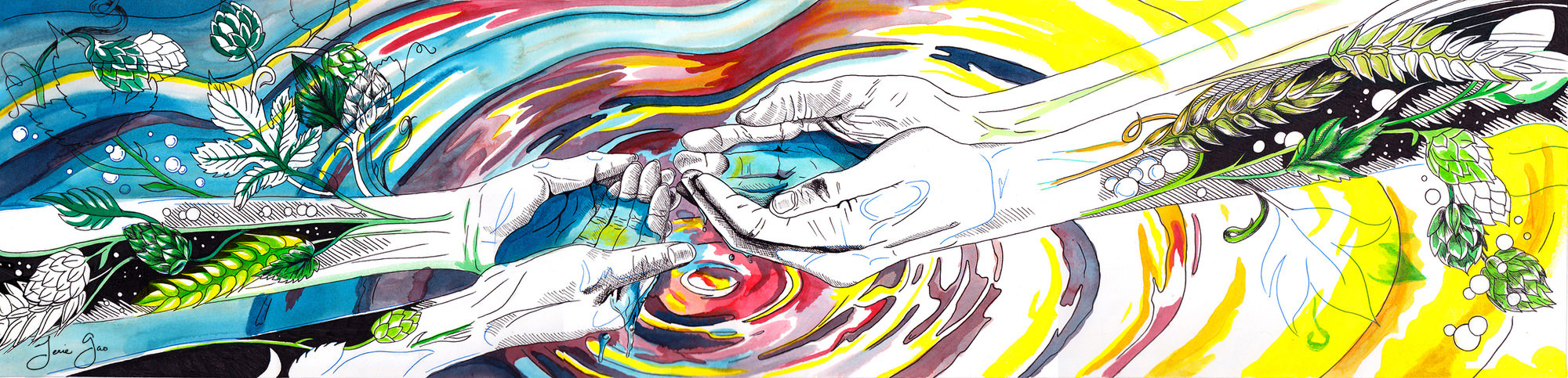 "Working Draft Beer Co. hired Jenie in the Spring of 2018 to produce a 200 sq. ft. original mural inside our taproom that would invoke the industry, artistry, and community inherent to brewing. Immediately, we were floored by the depth and breadth of conversations we had with Jenie. We spun general concepts, ideals, back-of-napkin notes, and from all of that she grasped and weaved and created a piece embodying what we could only half-articulate, which is exactly what art does! The mural, How We Gather, is now synonymous with Working Draft Beer Co., so much so that we had our delivery van fully wrapped in the image, transporting the mural throughout Madison on beer deliveries. Similarly, we have had beer koozies and glassware feature the mural, each a little totem of who we are as an organization."